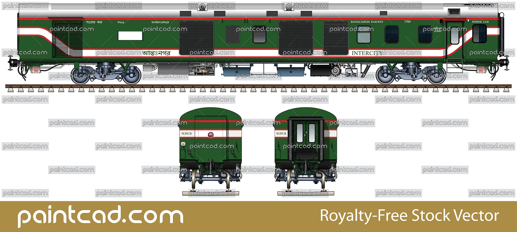 Side and front view with Indian Generator EOG coach in colors of Bangladesh Railway - green livery with white-red stripes. High-quality vector illustration with many detail and technical inscriptions in Bengali and English. Intercity express. EDITORIAL USE
