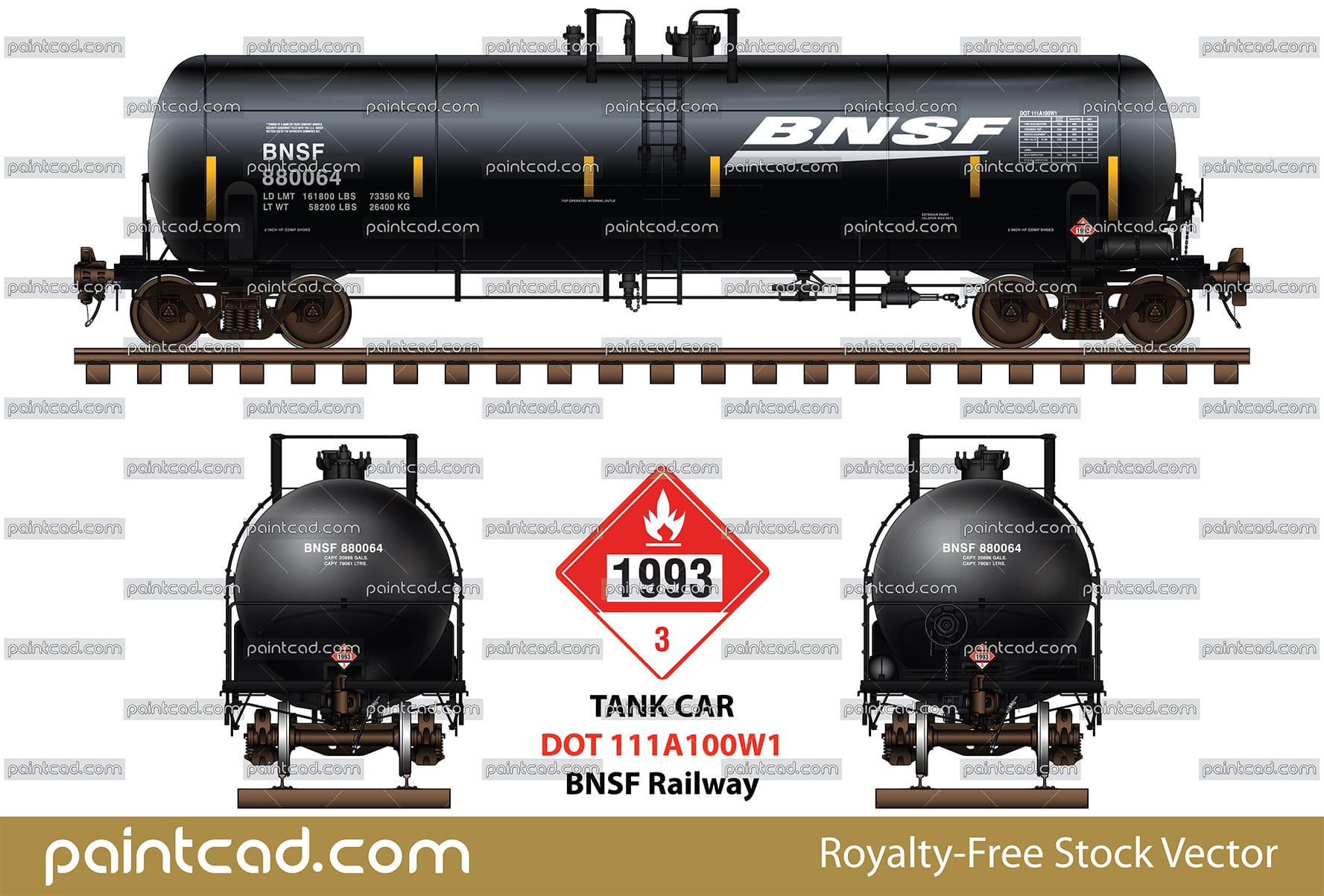 Side and front view with DOT 111 - General service tank car 20,900 Gallon. Reporting mark BNSF and flammable liquid placard with number UN 1993 for Hazardous material shipping. Detailed vector illustration with all signs and technical inscriptions. EDITORIAL USE