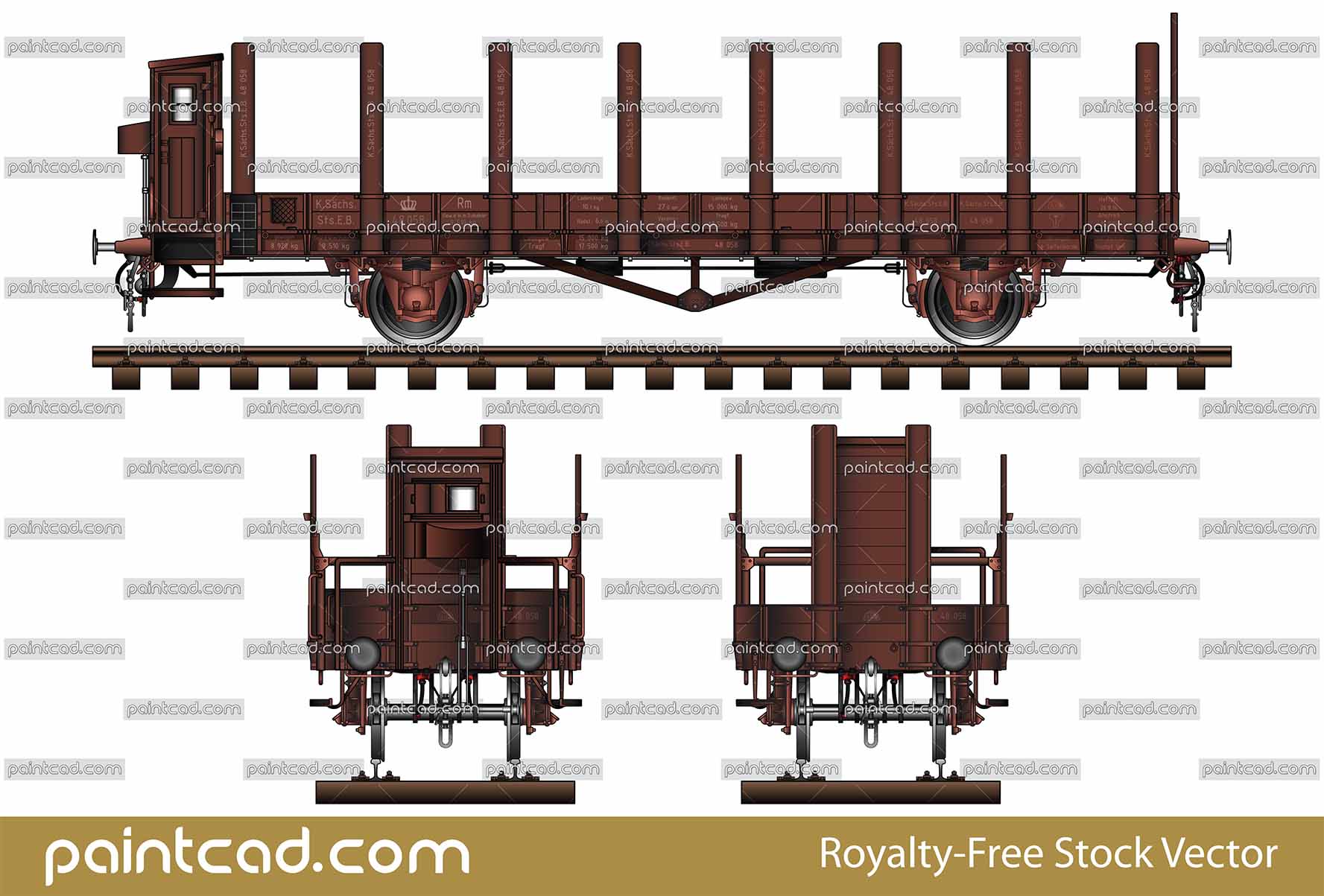 Side and front view of platform wagon in livery of the Royal Saxon State Railways. Brake cabin is located at the end of the car and serves as a shelter for brakeman from adverse atmospheric conditions.Original Prussian design with all technical inscriptions.