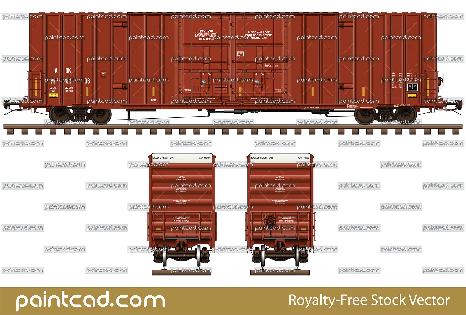 Vector illustration with American Gunderson type boxcar. Reporting mark Arkansas–Oklahoma Railroad. Red livery with white endings. Side and front view with all technical inscriptions in English. EDITORIAL USE