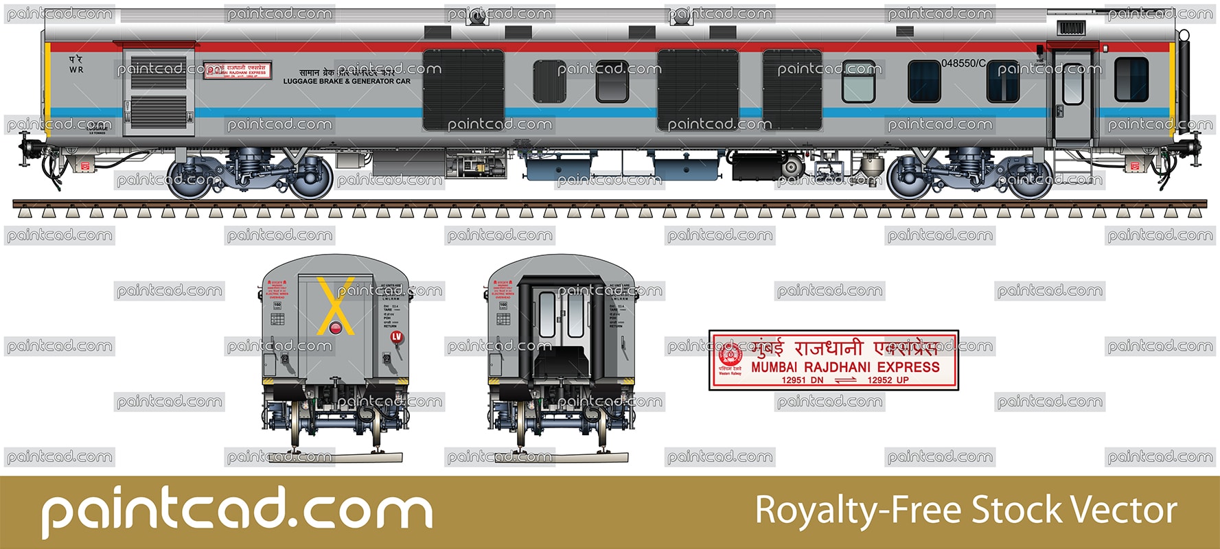 Side and front view with LHB power coach. Reporting mark WR - Western Railway zone of Indian Railways. Detail - route plate of train 12951/ 12952 from Mumbai to New Delhi with inscriptions in Hindi and English. EDITORIAL USE