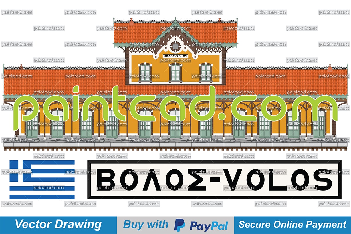Architectural color drawing with front view of reception building of the train station in the Greek port city of Volos, regional unit Magnesia, part region of Thessaly. The project of building was designed by the Italian Evaristo de Chirico. The terminal was opened on 22 April 1884 by King George I - King of Greece in this period. Two standard tracks are located in front of the building with a gauge of 1435 mm.