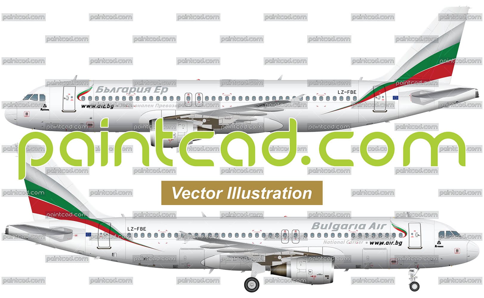 Left and right view of passenger plane in flight and on the ground. Details - tricolor livery, logo of "Armeec" Insurance, stylized inscriptions "National carrier" in English and Bulgarian, landing gear and others. Reporting mark LZ-FBE. Detailed vector created by real photos. EDITORIAL USE