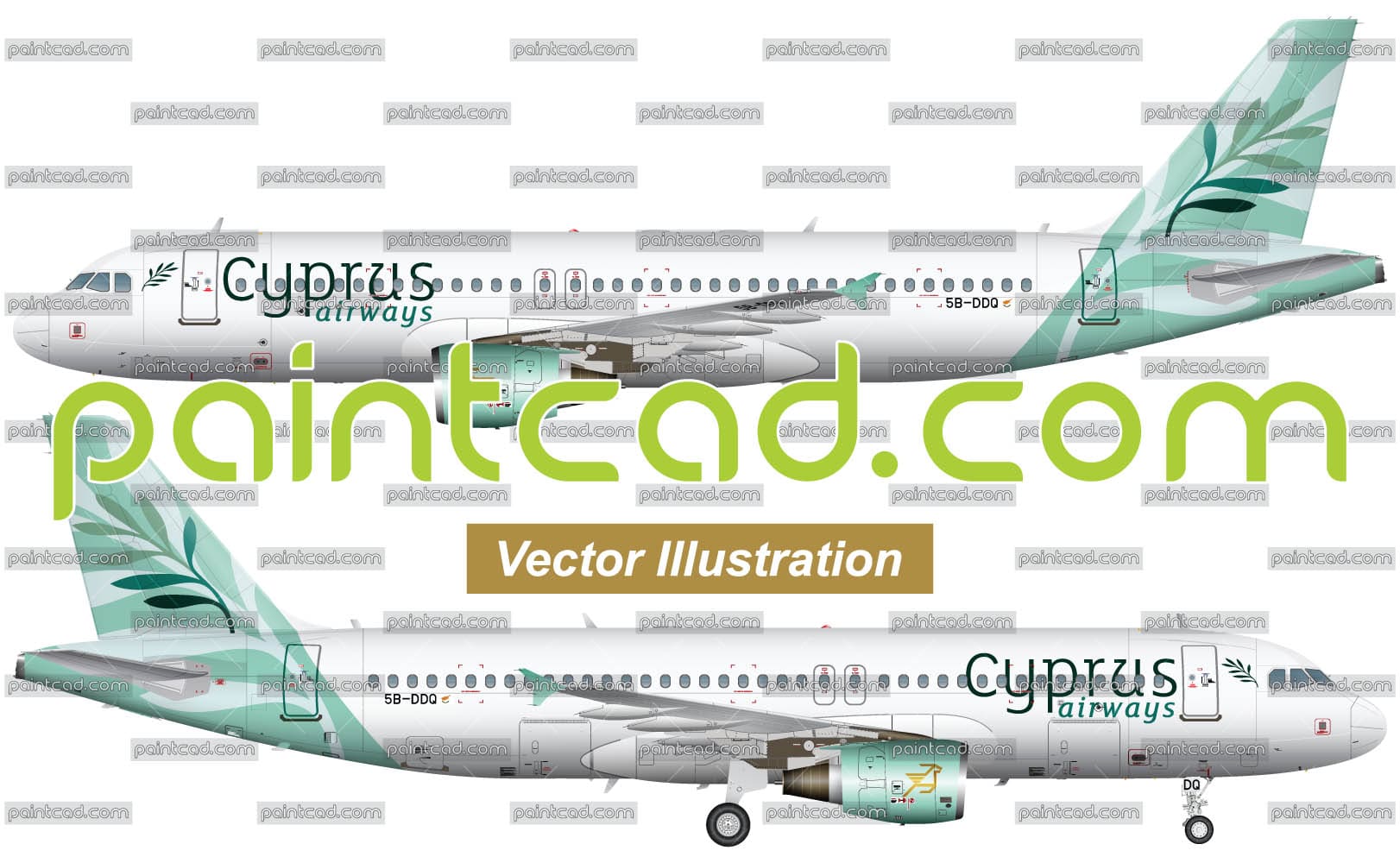 Left and right panoramic view of passenger airplane in flight and on the ground. Reporting mark 5B-DDR. High-detailed vector graphics. EDITORIAL USE