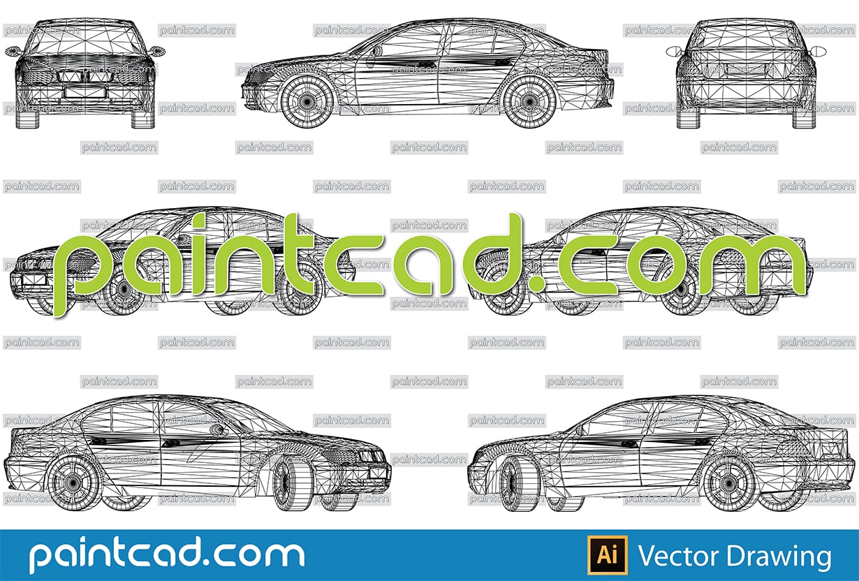 Wire model of luxury car produced in Germany. Sleek and aerodynamic design and Business class. Front, rear, side and axonometric view. Three-dimensional polygonal design.