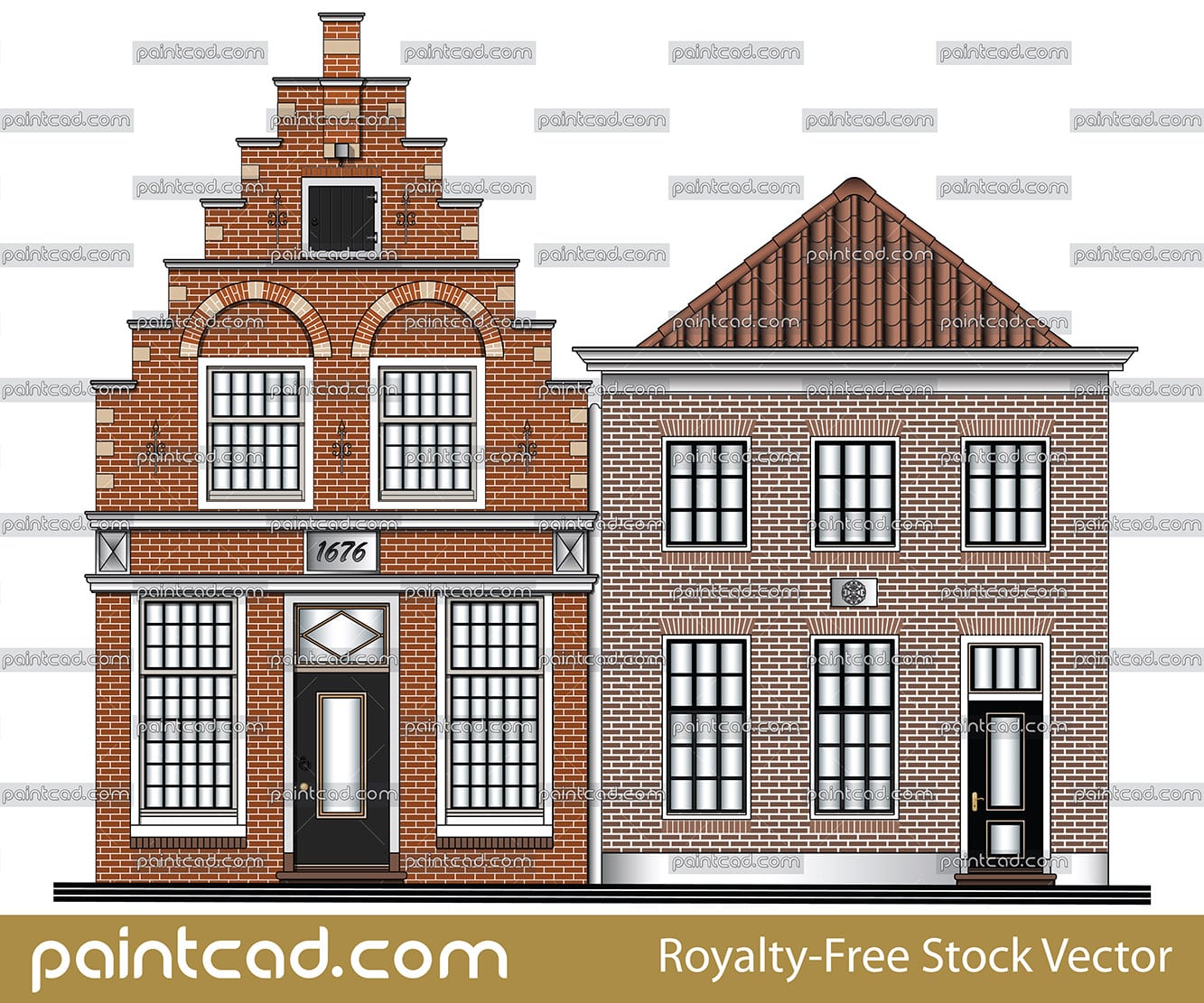 Two Dutch canal houses. Left facade have a wall in style step gables. Behind the wall is located a dual pitched roof. At the top of the building have a single window that serves as entrance for the transfer of cargo from the winch over it. Both houses have a visible brickwork and shaped fugues.