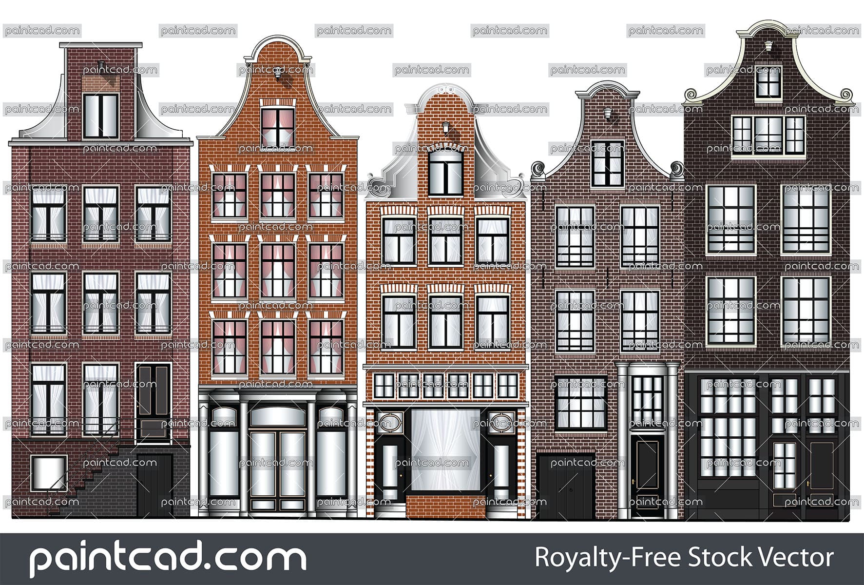 Facades of canal houses from capital of Netherlands. Buildings in the Dutch capital usually have a basement for storage a goods and serve to prevention of flooding. They are slim, long in depth, high and have a narrow stairways.