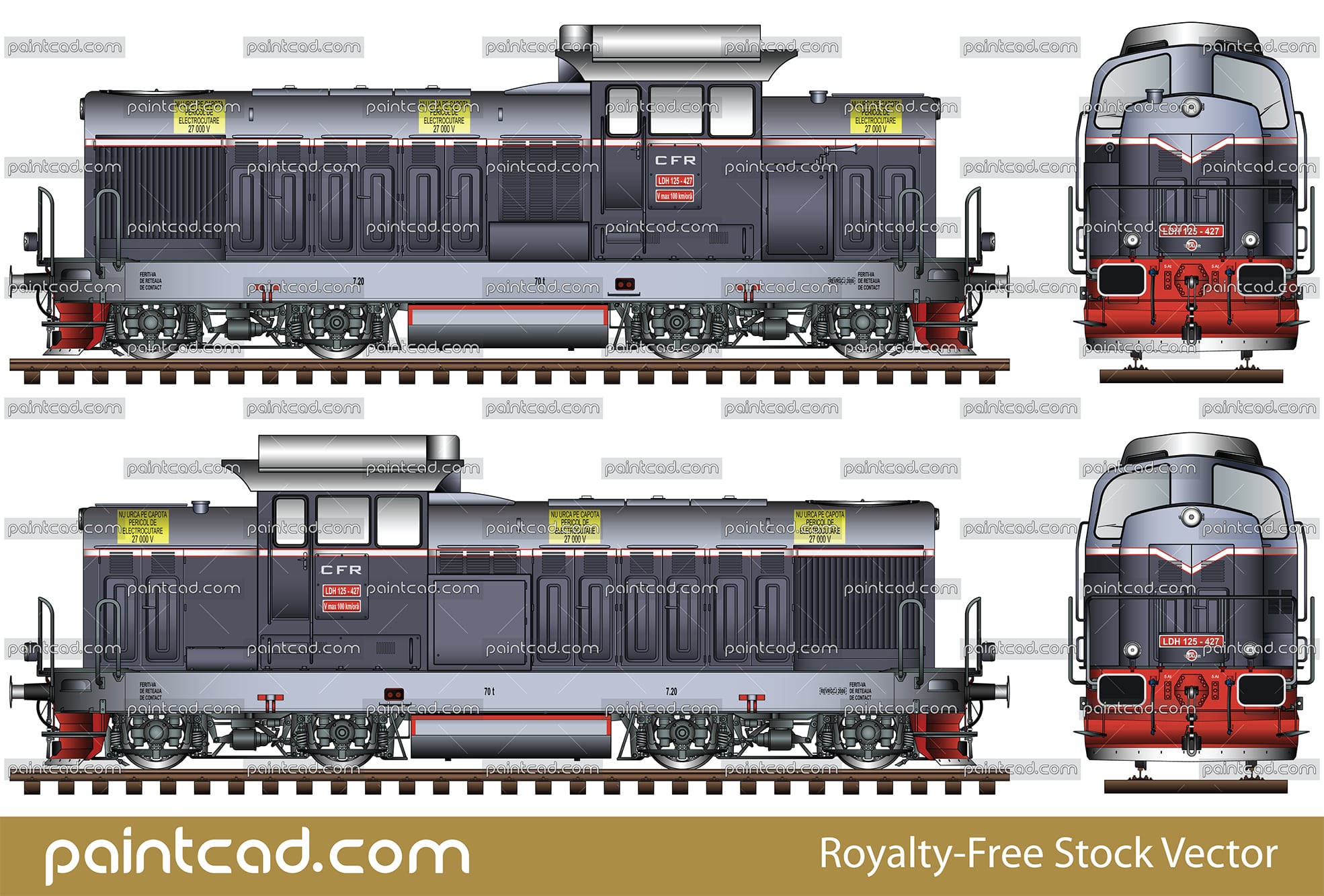 Side and front view of Romanian diesel locomotive LDH 125. Classic light-dark gray livery with white stripe of Căile Ferate Române. High-quality technical illustration with all details and inscriptions. EDITORIAL USE