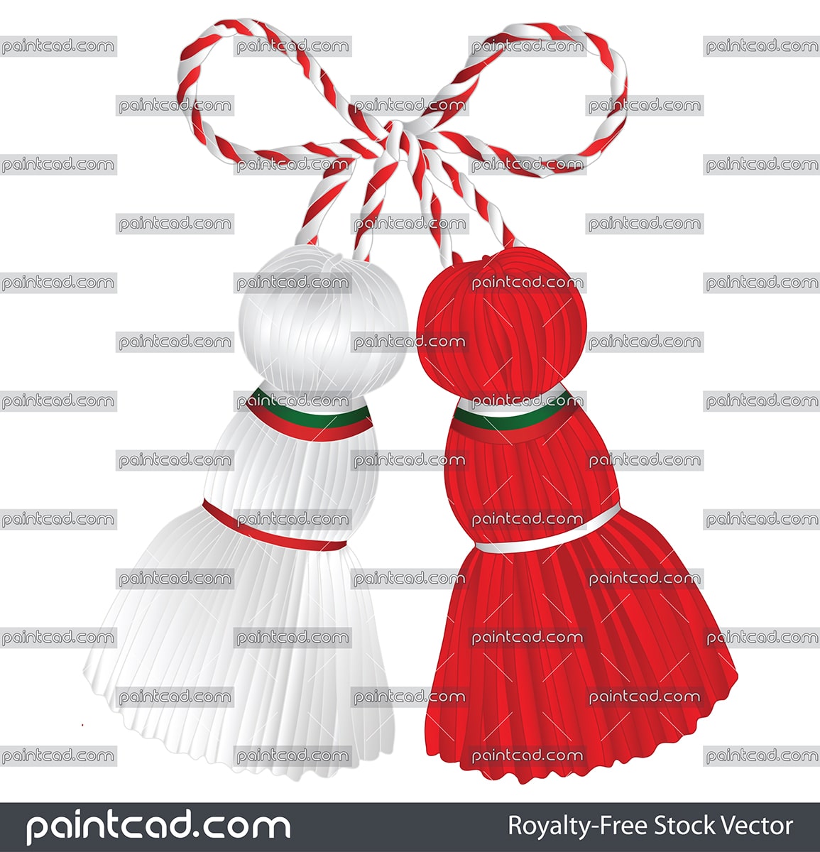 Vector illustration of stylized Bulgarian Martenitsa Pijo and Penda made from white and red wool yarn. They are decorated with tricolor ribbon of the Bulgarian national flag. Isolated objects over white background.