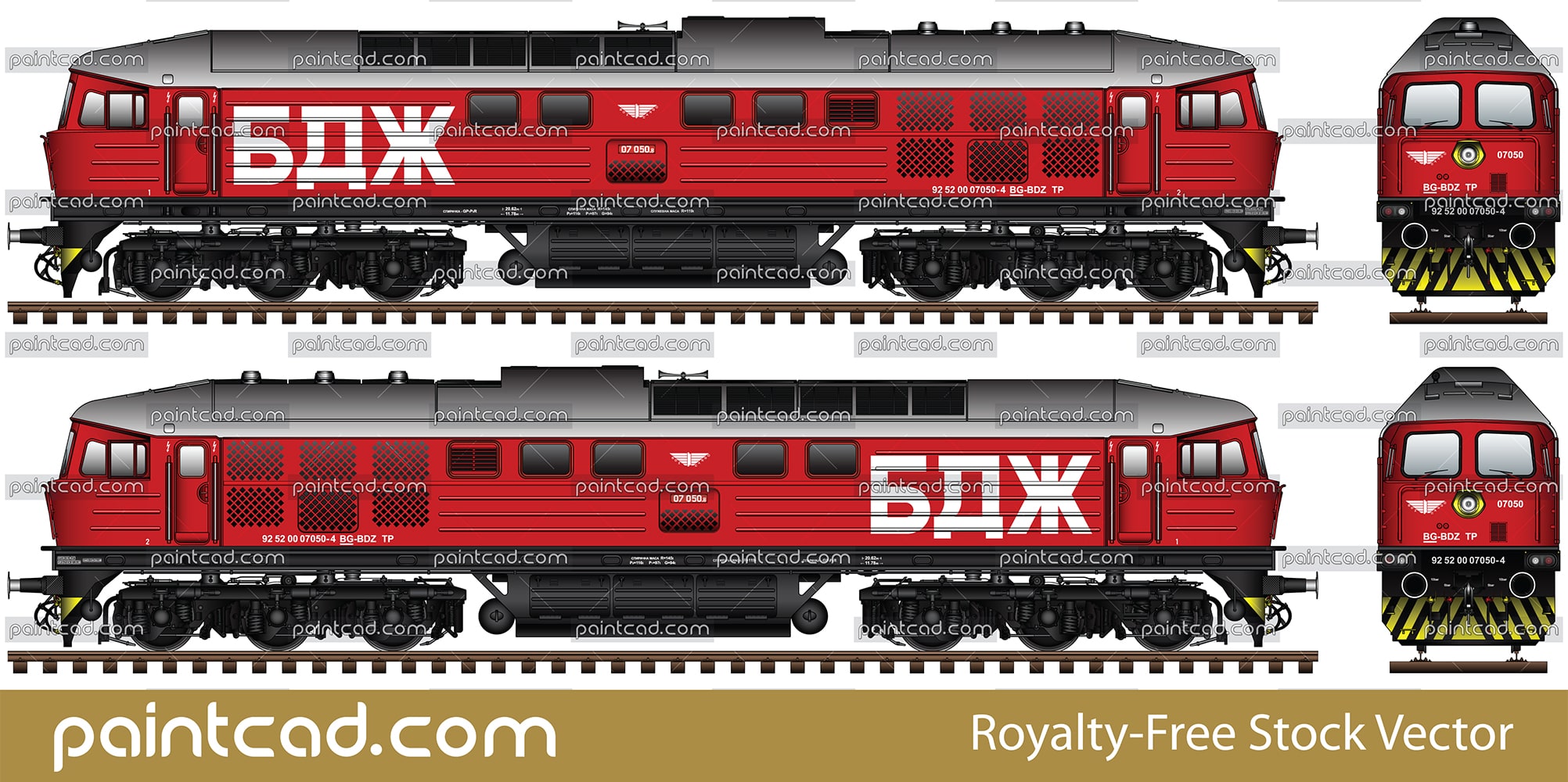 Side and front view of Bulgarian teplovoz serie 07 and nickname "Ludmilla". Designation according Bulgarian State Railways, Division "Freight transport". Details - bogies, headlights, air hoses, buffers, stylized logo of BDZ Cargo and all techical inscriptions. EDITORIAL USE